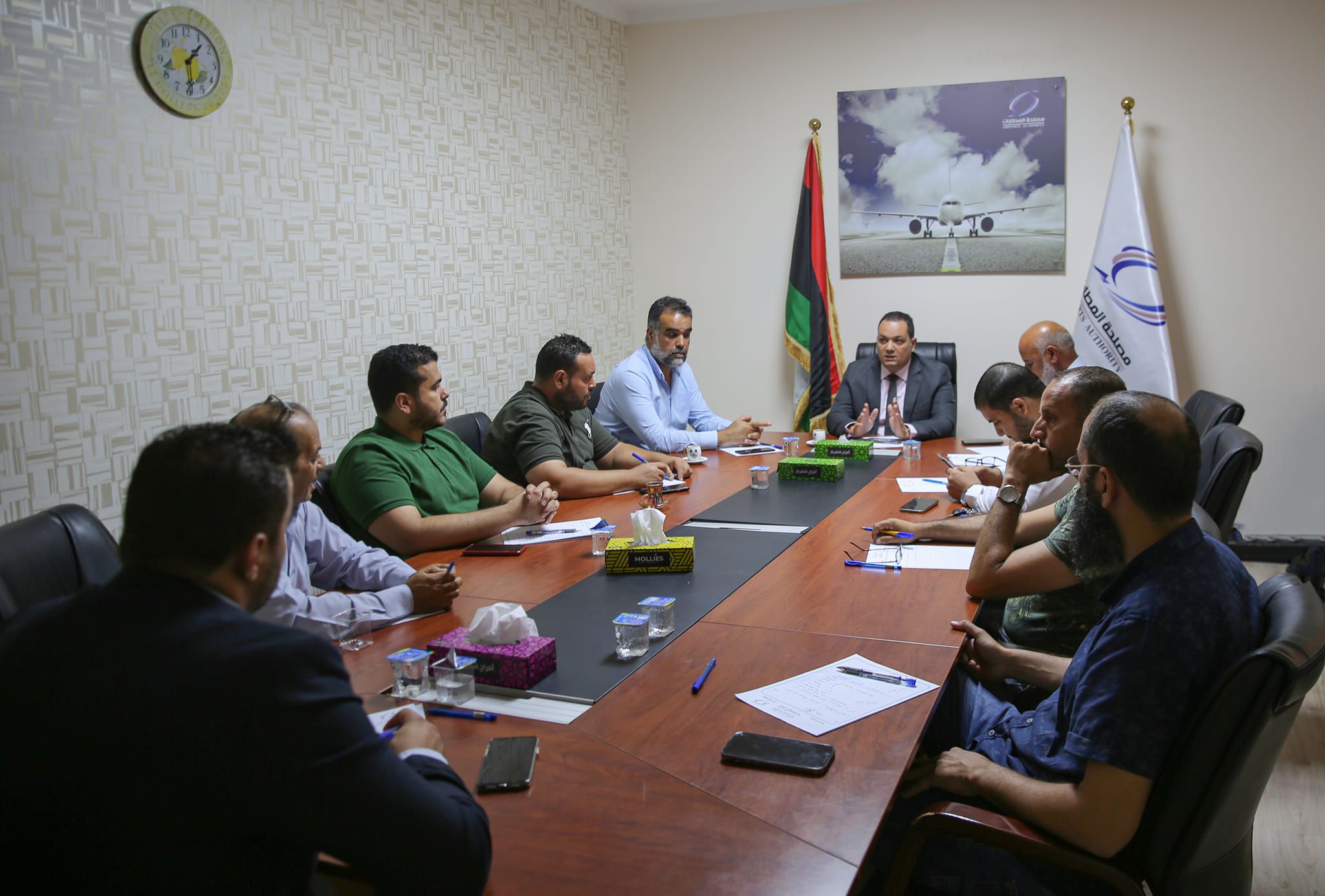 كما تم مناقشة المشاكل والصعوبات الإدارية التي تواجه إدارة المطار في تسيير العمل اليومي بالشكل المطلوب والاجراءات التي يجب اتخاذها للارتقاء بالعملية التشغيلية وتحسين الخدمات المقدمة بالمطار.