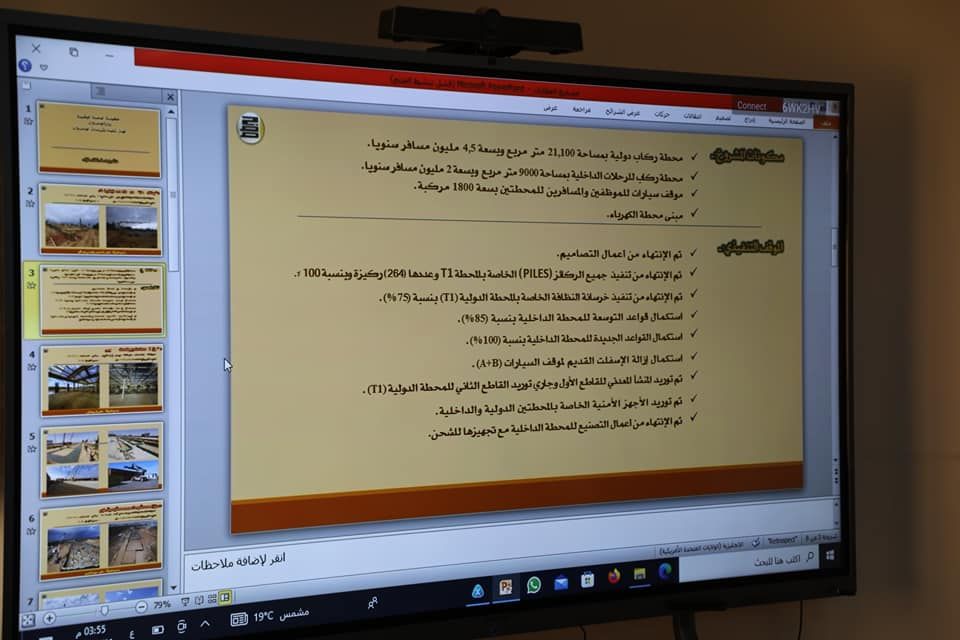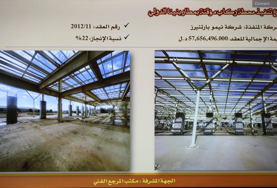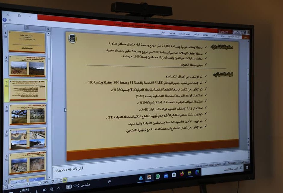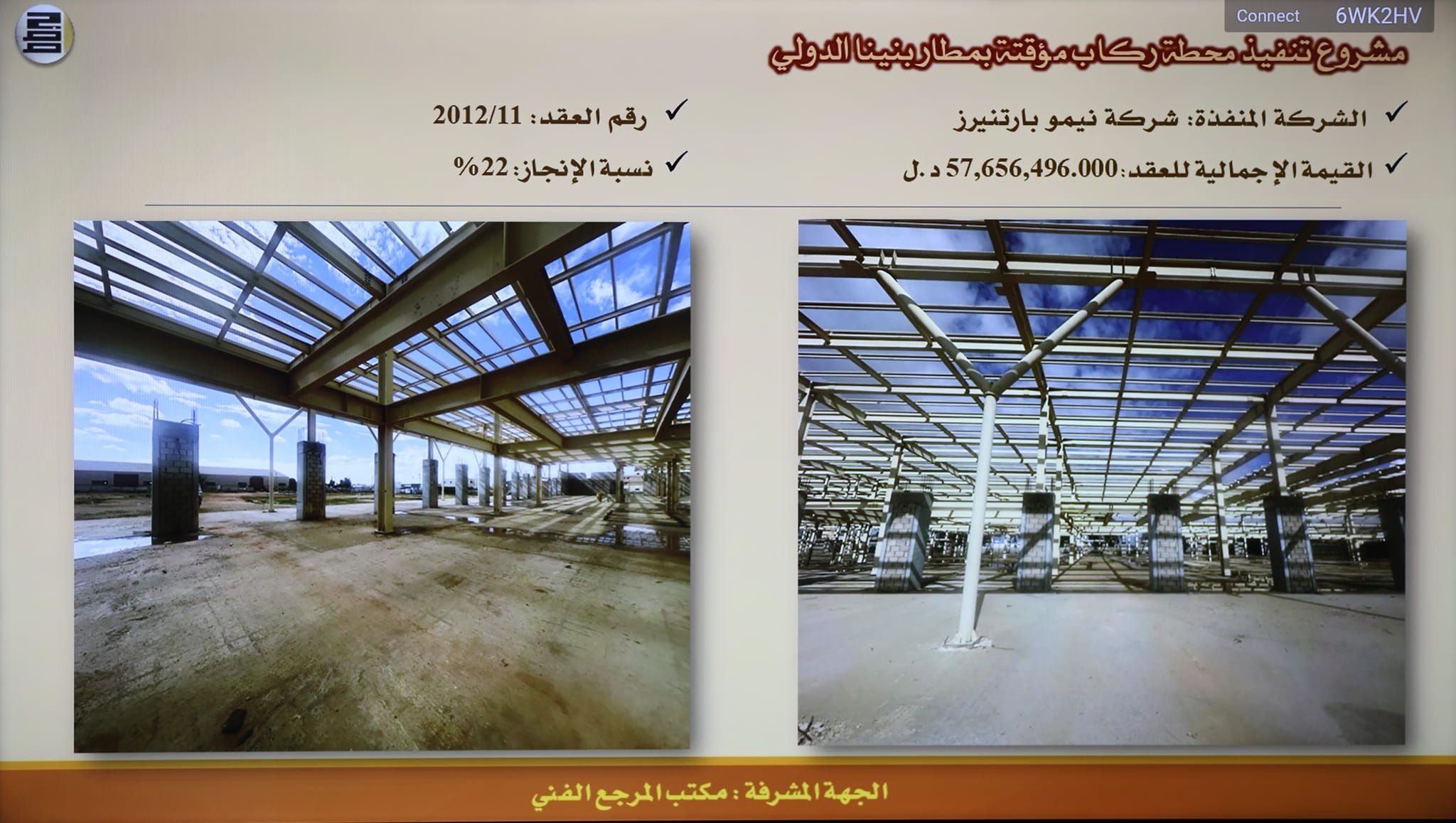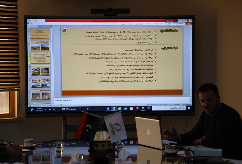وتم خلال الاجتماع عرض مرئي يبين أعمال البناء والتشييد ومشاريع تطوير للمطارات الرئيسية في ليبيا، ومناقشة مجموعة من مشاريع تطوير المطارات في ليبيا، والتركيز على المطارات الرئيسية : مطار طرابلس العالمي، ومطار بنينا، ومطار معيتيقة، ومطار مصراتة، ومطار سبها.