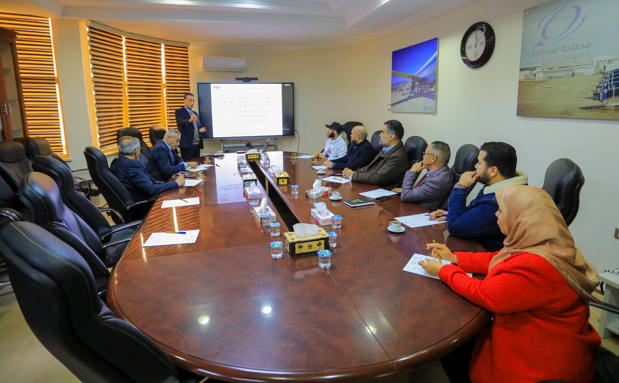 عُقد اليوم الخميس الموافق 2023/12/21 بمقر مصلحة المطارات إجتماع تقابلي مع شركة TUV النمساوية حضره من طرف المصلحة مساعد الرئيس ومدير إدارة التخطيط والتنظيم ومدير ادارة مطابقة المعايير ومدير المكتب القانوني المكلف ورئيس قسم التطوير التنظيمي.