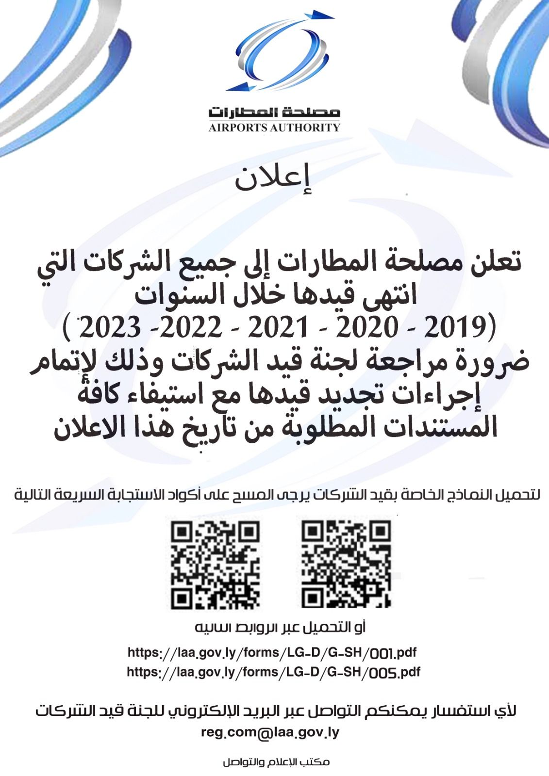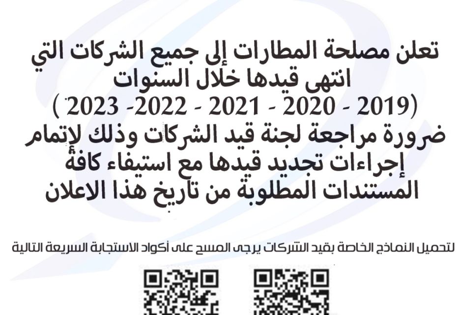 ندعو جميع الشركات التي انتهى قيدها خلال سنوات 2019 و2020 و2021 و2022 و2023 للمراجعة الفورية للجنة قيد الشركات بمقر المصلحة بمدينة طرابلس منطقة النوفليين وذلك لاستيفاء كافة المستندات والمصوغات القانونية اللازمة لتجديد قيدها.
