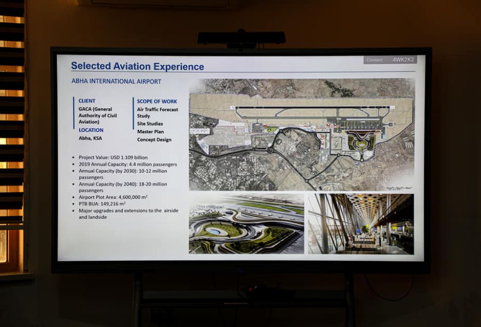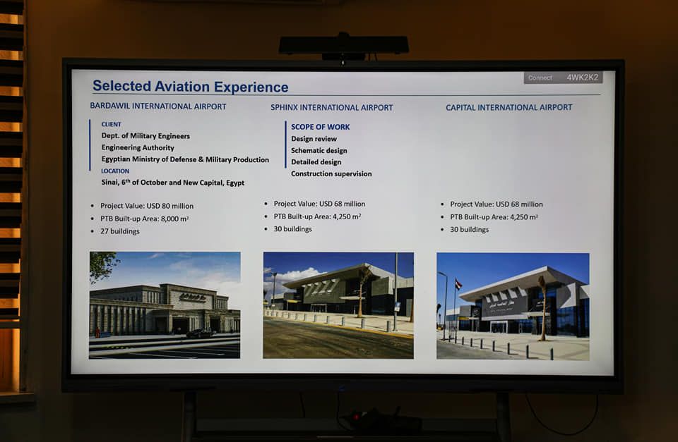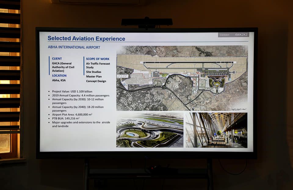 حيث أوضحت الشركة من خلال عرضها امكانياتها الفنية وخبرتها السابقة التي تتجاوز الخمسين عاماً في مجال الاستشارات الهندسية واستعرضت عدد من المشاريع التي تم تنفيذها من طرفها في العديد من المطارات خاصة في منطقة الشرق الأوسط وأفريقيا والتي من بينها أعمال اعداد الدراسات وتقديرات نمو الحركة الجوية بالمطارات وتقييم واختبار مواقع تنفيذ الأعمال واعداد التصاميم التفصيلية للإنشاءات والبنية التحتية وإدارة المشاريع ومراقبة الجودة.