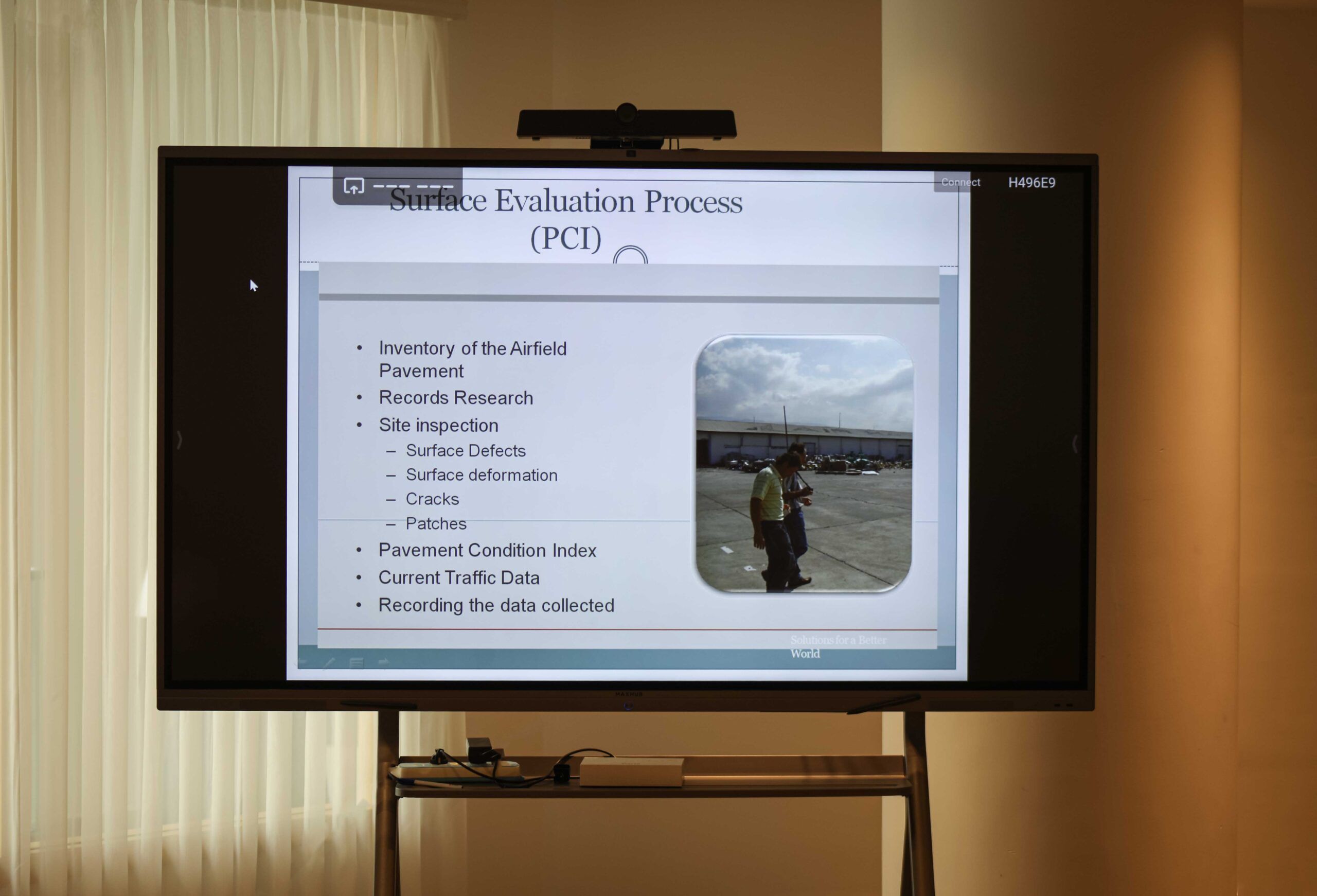 وخلال العرض، قدّم فريق الشركة شرحاً وافياً حول طبيعة أعمالها باعتبارها إحدى الشركات المتخصصة في معاينة وكشف حالة مهابط المطارات، وذلك من خلال إجراء الاختبارات المعملية والفنية لتقييم حالة طبقات التأسيس والرصف، وتحديد نسب التهالك وطرق المعالجة المناسبة.
