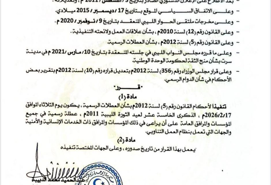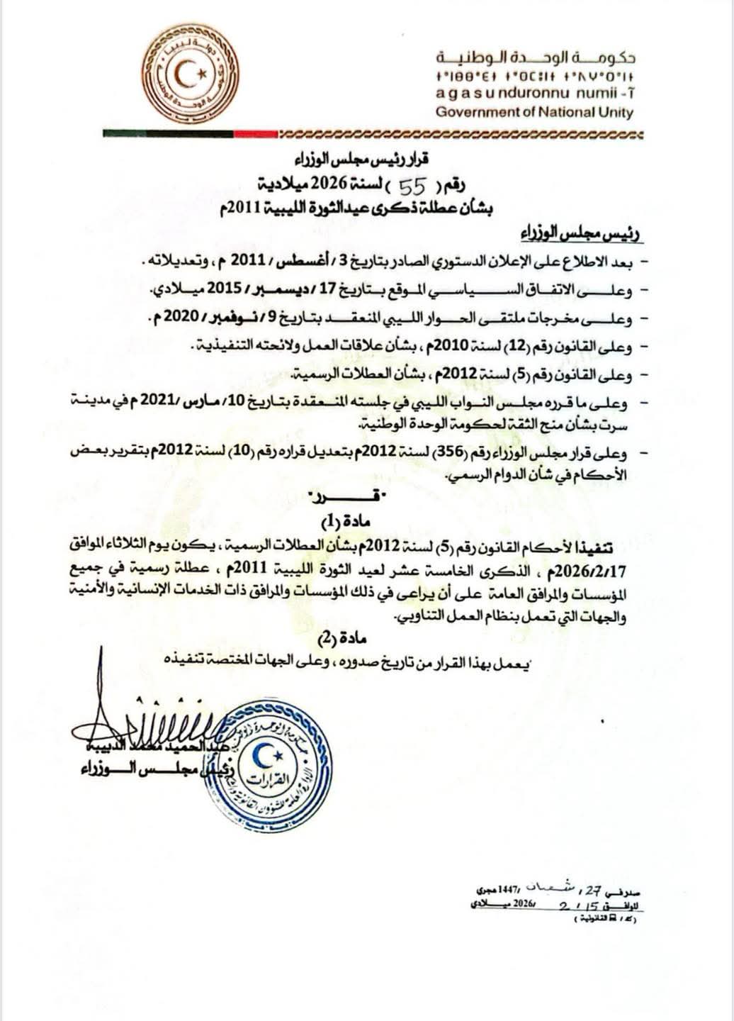 أصدر رئيس مجلس الوزراء القرار رقم 55 لسنة 2026، بشأن اعتبار يوم الثلاثاء الموافق 17 فبراير 2026 عطلة رسمية بمناسبة الذكرى الخامسة عشرة لثورة 17 فبراير.